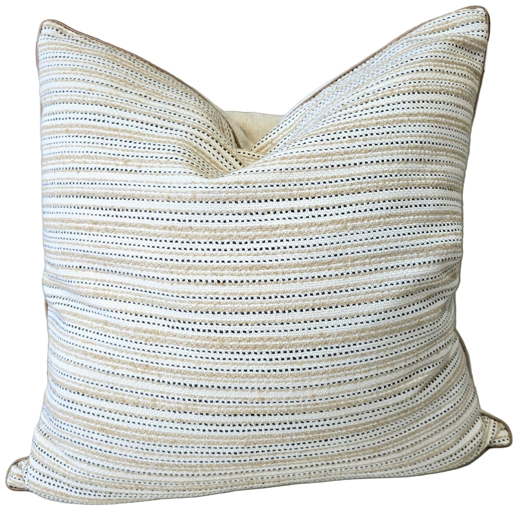 Crisp, casual, and effortlessly stylish. This woven throw pillow features a timeless horizontal pinstripe pattern created by alternating bands of soft tan and dark charcoal stitching against a cream background. The slightly raised texture of the stripes adds a lovely tactile quality, making it an excellent choice for modern farmhouse, coastal, or contemporary decor styles.