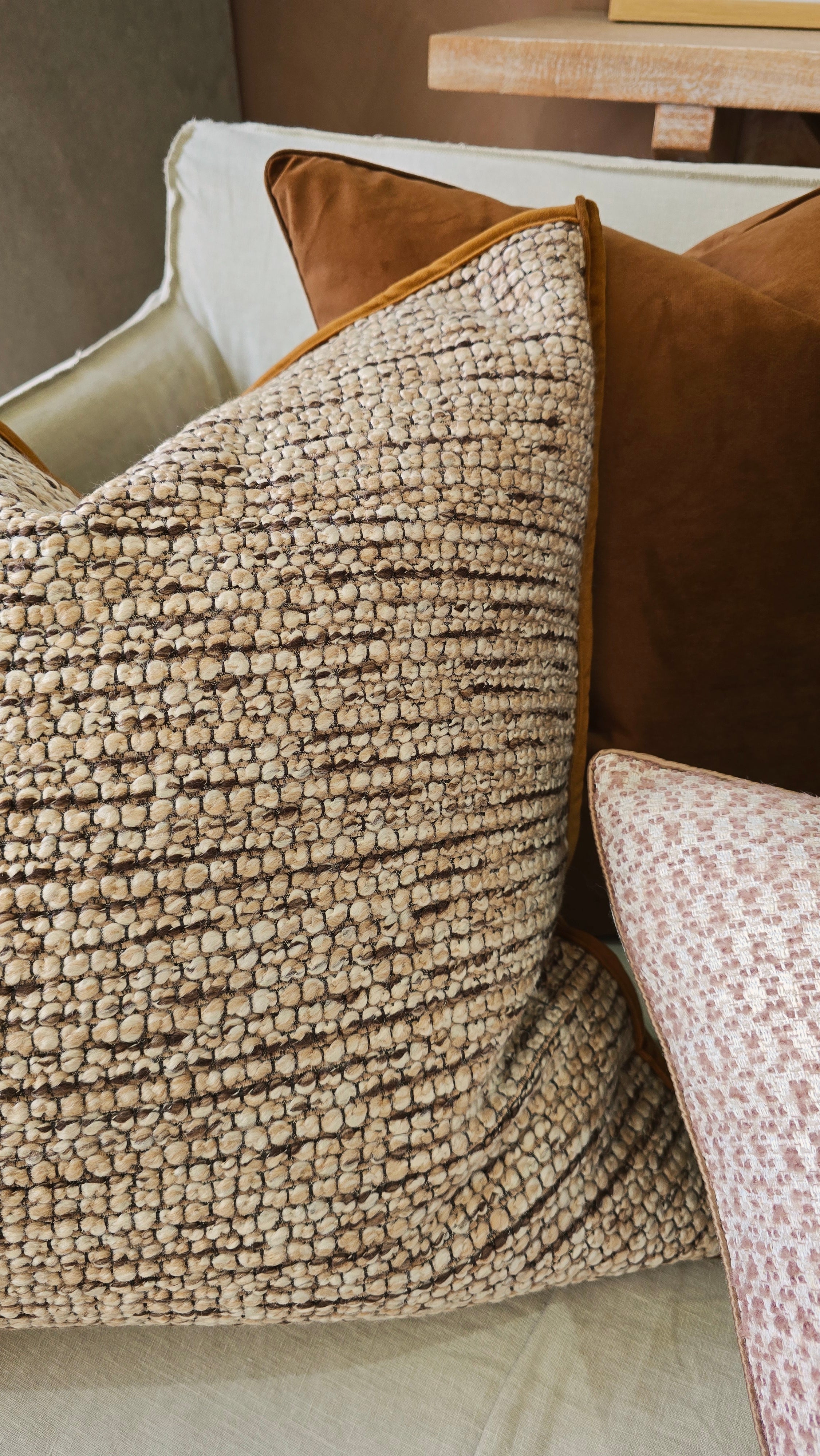 Embrace bold textures with the Desert Ridge Nubby Cushion. This highly tactile piece features a chunky, bouclé-like beige and cream weave, accented by rustic dark brown horizontal stripes. Framed by a striking burnt orange, velvet-textured piped border, this cushion is a statement-maker. It is ideal for adding depth, warmth, and an artisan-crafted feel to your favorite armchair or sofa.