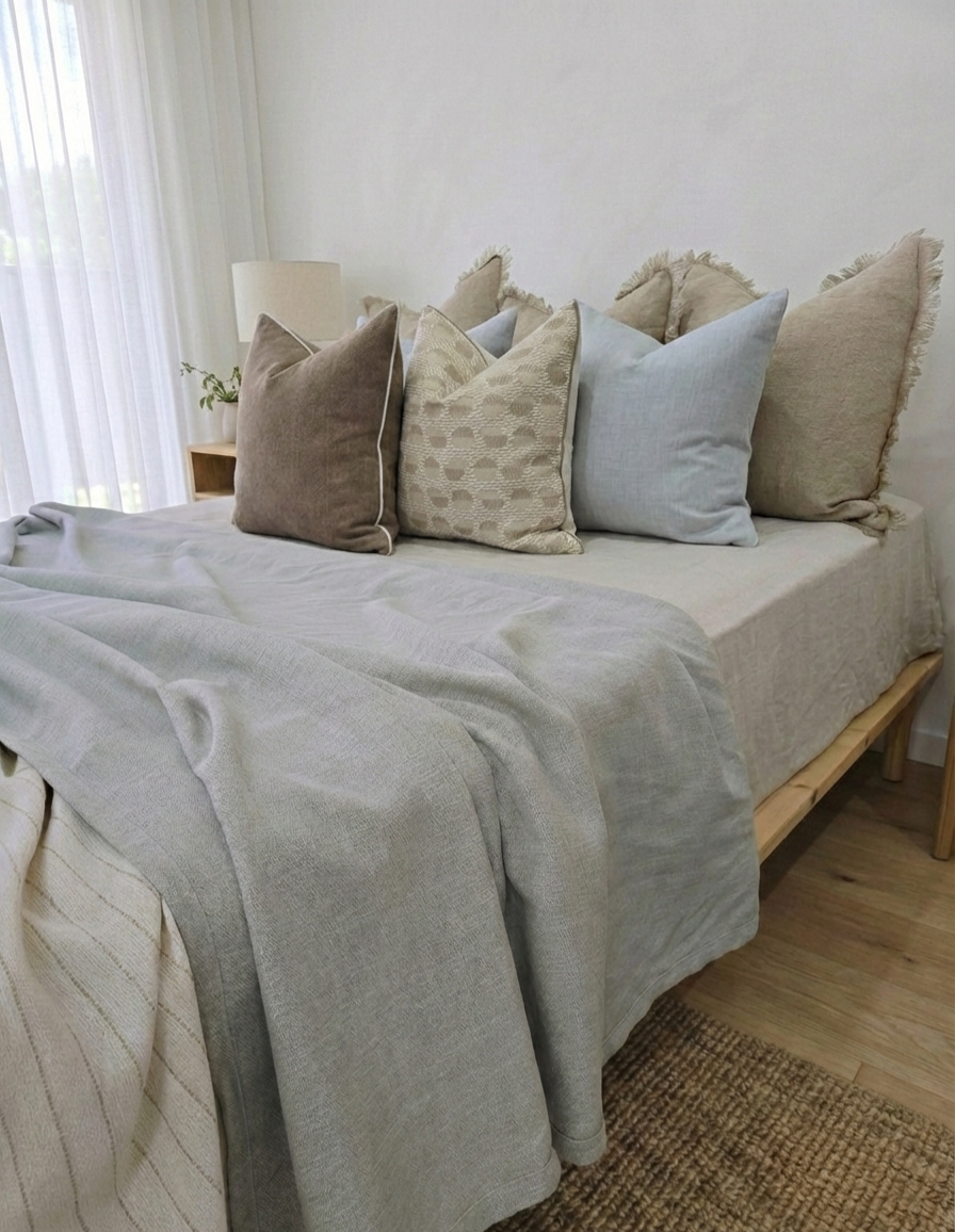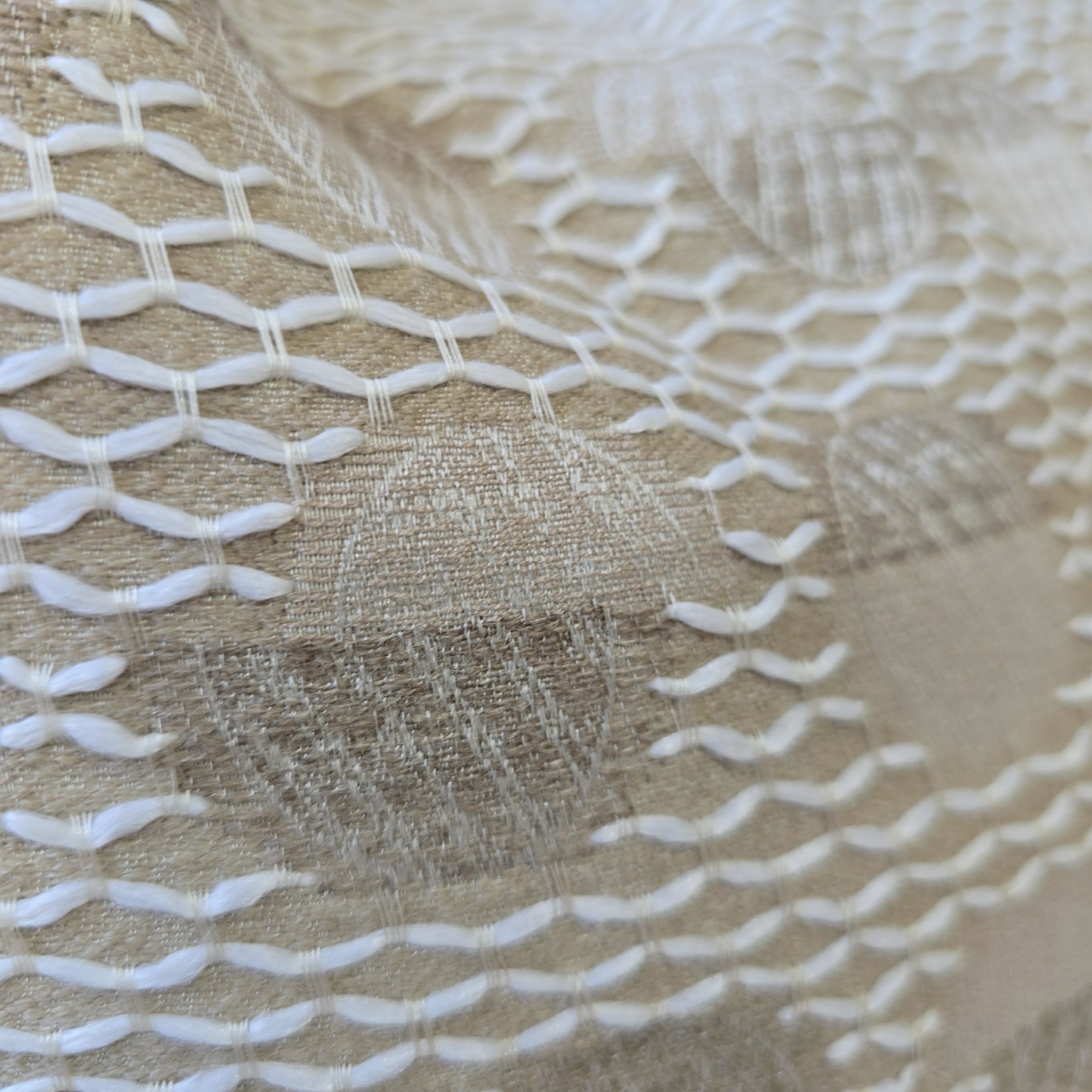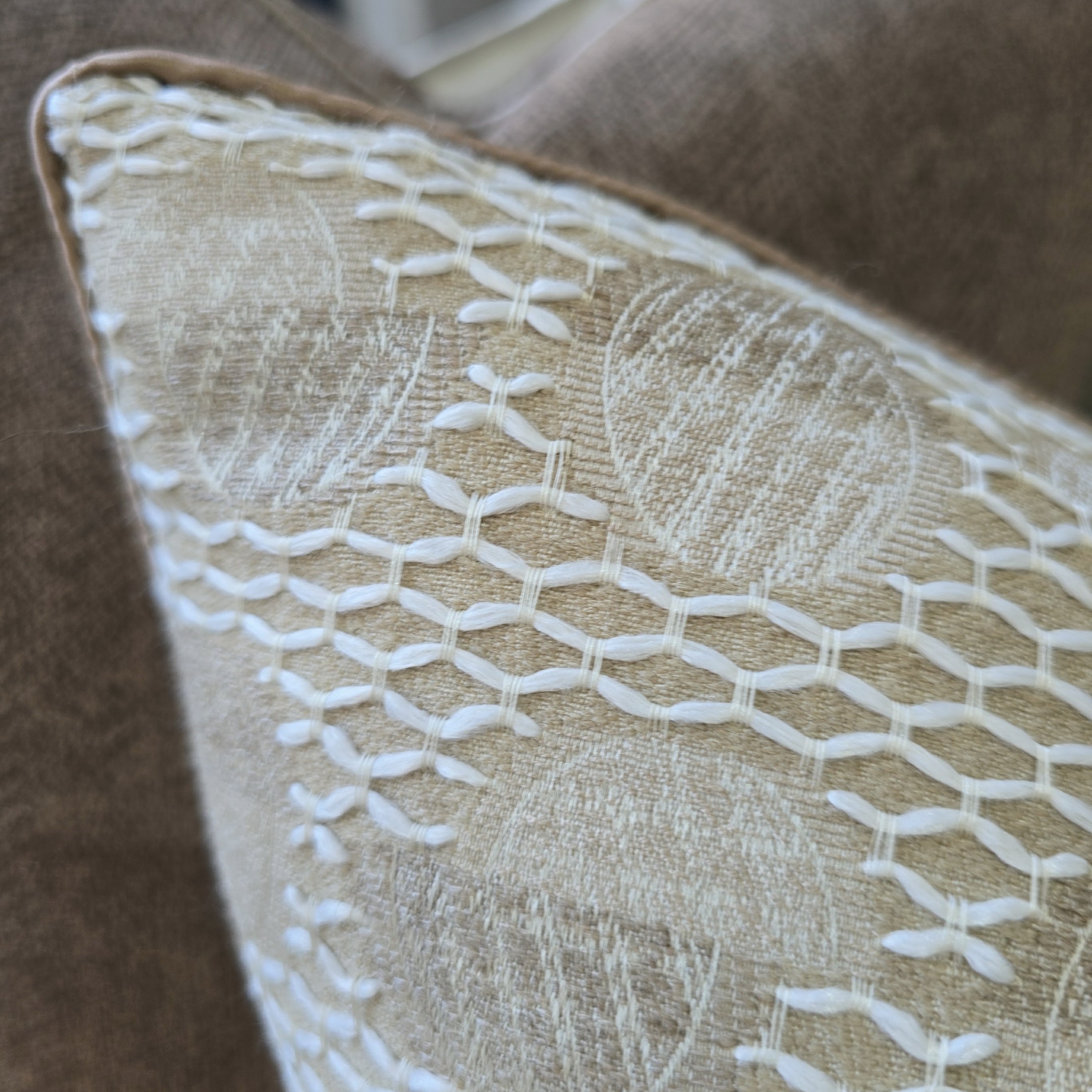 This elegant throw pillow beautifully balances understated neutrals with rich, multi-layered textures. It features a warm, sand-colored jacquard base woven with a subtle, tonal circular motif. Overlaid across the surface is a striking, raised white embroidery in a continuous honeycomb or trellis pattern. Finished with a neatly tailored piped edge, this cushion adds both a tactile artisanal quality and a touch of modern sophistication to any sofa or bed.