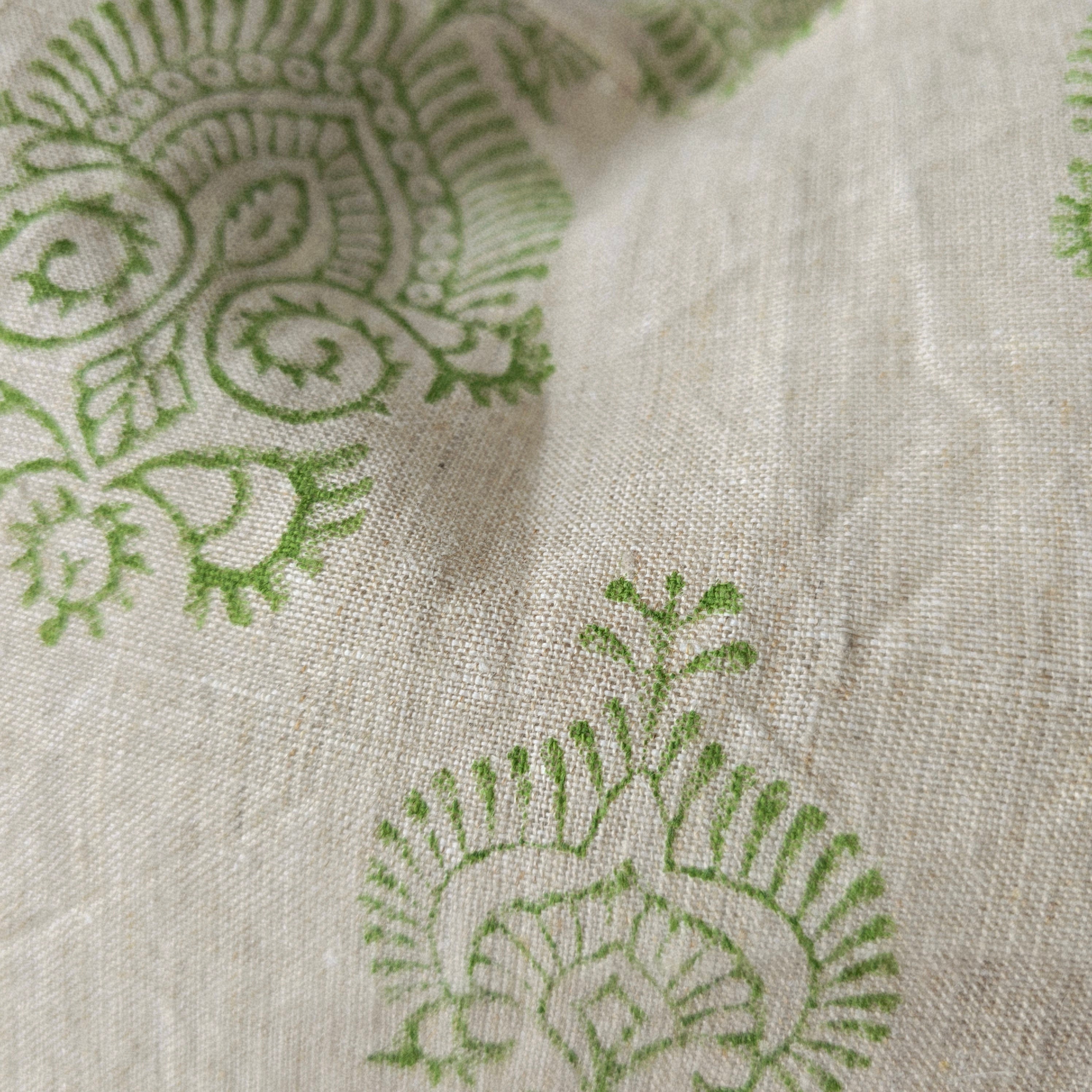 DoubleHand block-printed on theoatmeal/natural flaxlinen ground