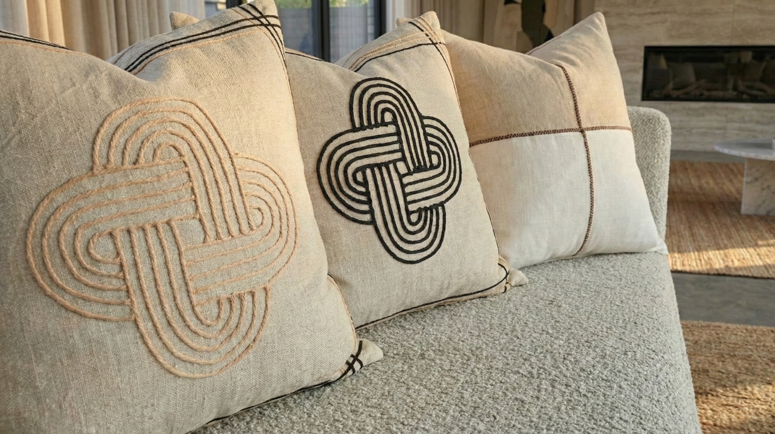 This sophisticated cushion combines natural linen and cotton in a timeless natural and black palette, featuring an intricate Celtic knot pattern that adds visual depth and cultural character to any interior. The blend of premium fibres ensures durability whilst maintaining a soft, inviting texture ideal for lounges, bedrooms, or accent seating. The generous size makes it a statement piece that complements both contemporary and traditional décor schemes. Perfect for those seeking quality craftsmanship with understated elegance.
