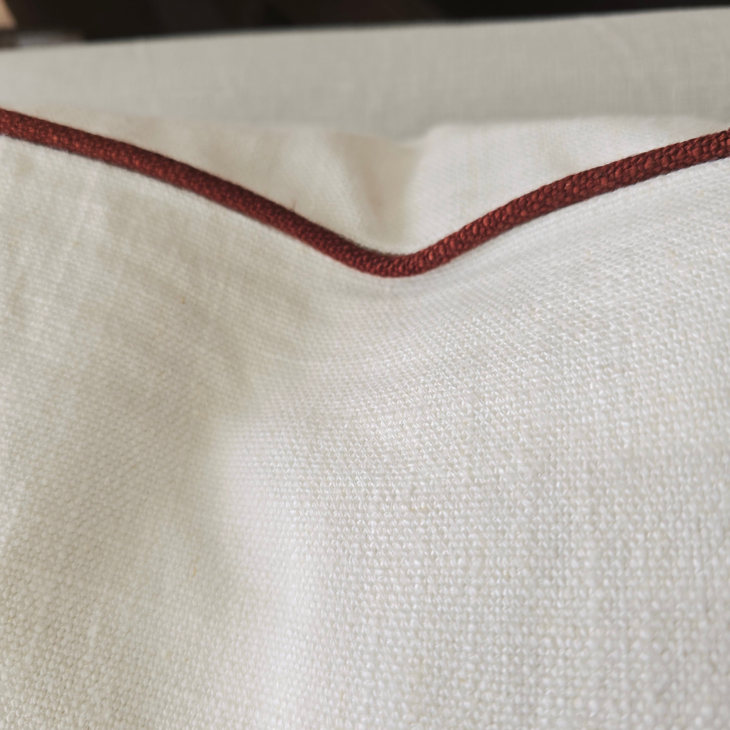 Crafted from substantial heavyweight linen, this cushion marries understated elegance with tactile luxury. The crisp white ground is punctuated by a sophisticated merlot red border, introducing a moody, rich dimension that elevates any interior scheme. The generous proportions and quality construction make it equally suited to layering on sofas or anchoring a bedroom arrangement. A versatile investment piece that balances contemporary minimalism with warmth.