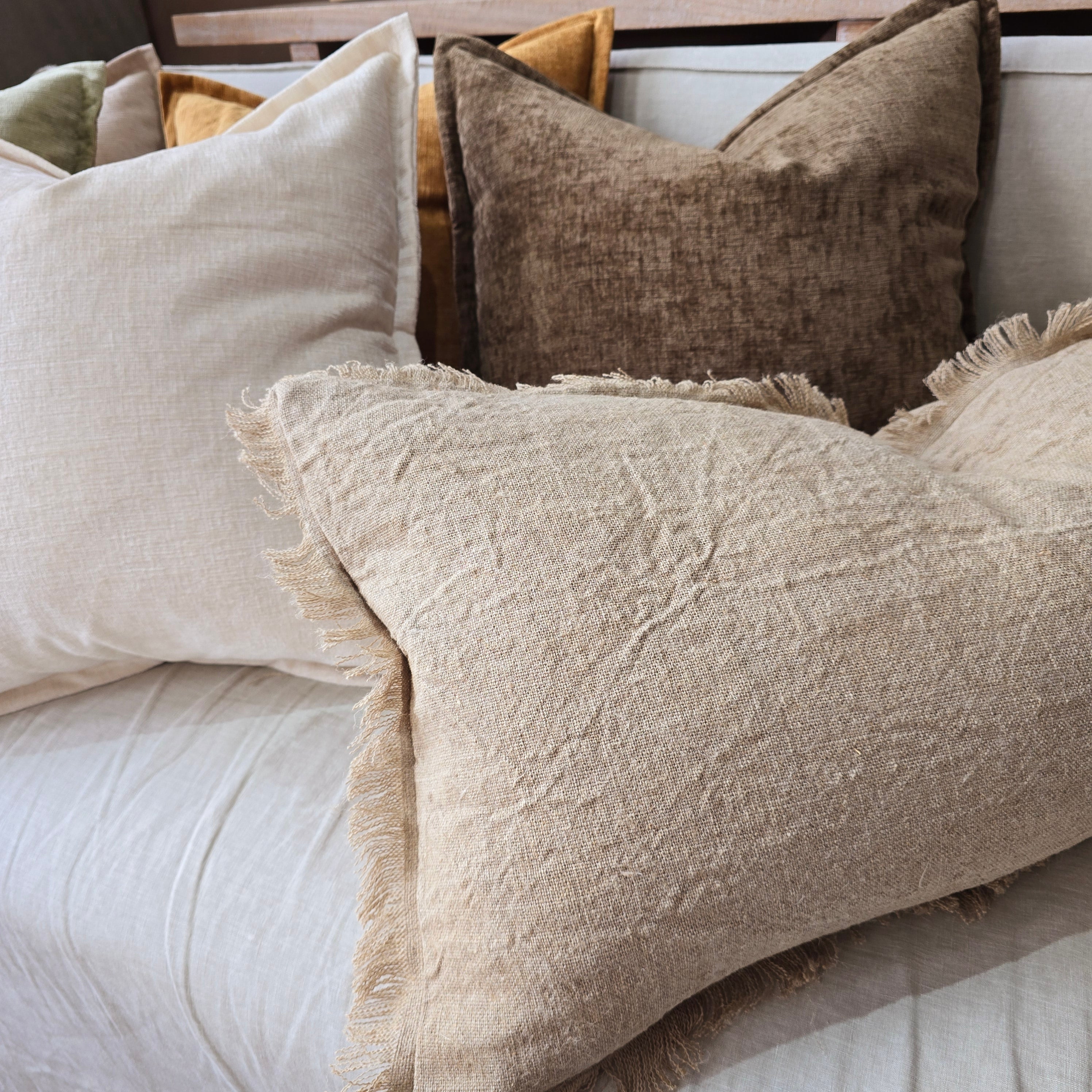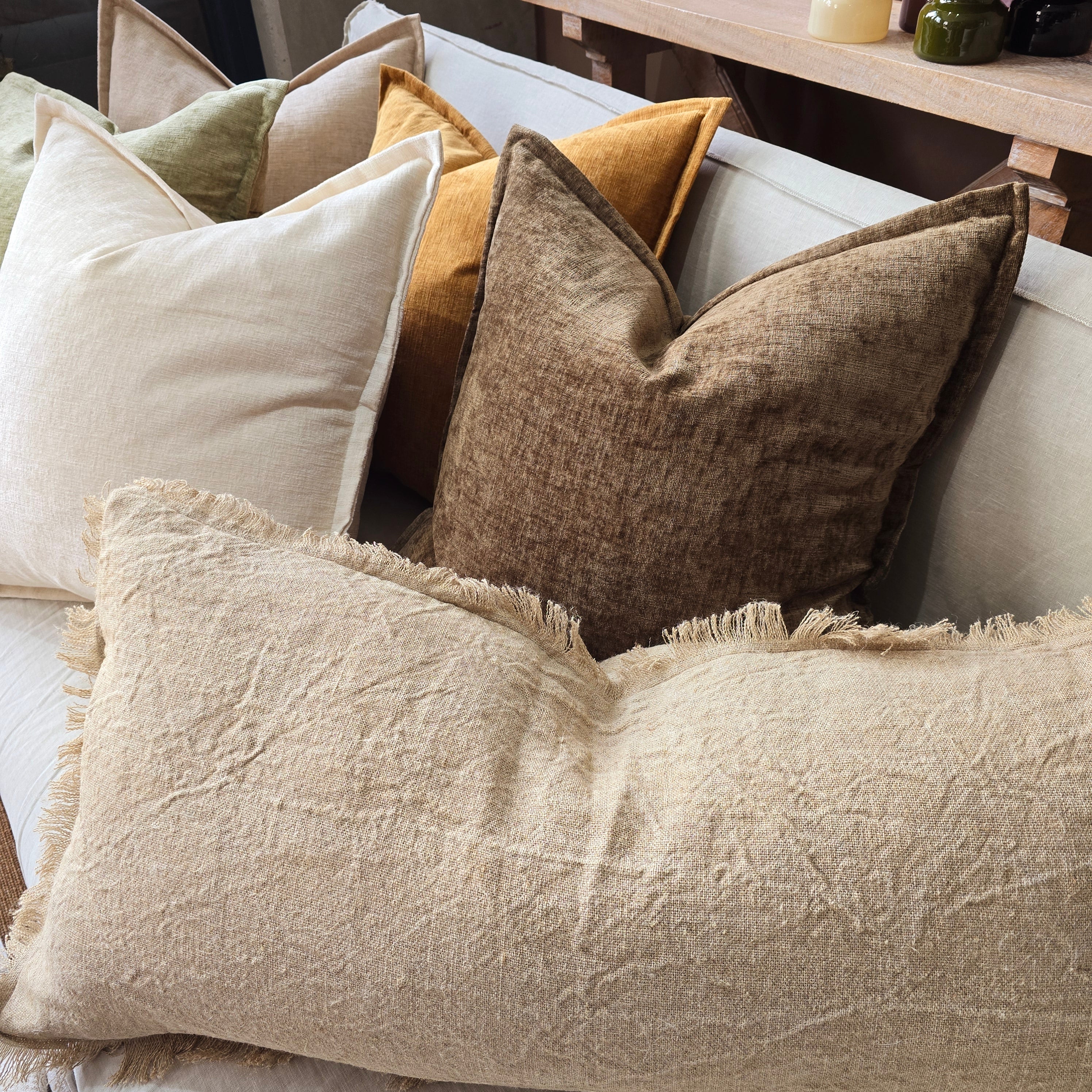 Riviera Heavy Weight Texture French Linen Fringed Edge Cushion 40x90cm Long Lumbar - Mocha