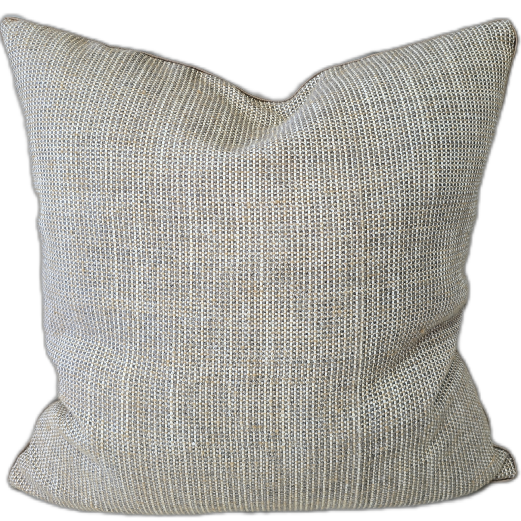 This elegant throw pillow beautifully balances understated neutrals with rich, multi-layered textures. It features a warm, sand-colored jacquard base woven with a subtle, tonal circular motif. Overlaid across the surface is a striking, raised white embroidery in a continuous honeycomb or trellis pattern. Finished with a neatly tailored piped edge, this cushion adds both a tactile artisanal quality and a touch of modern sophistication to any sofa or bed.