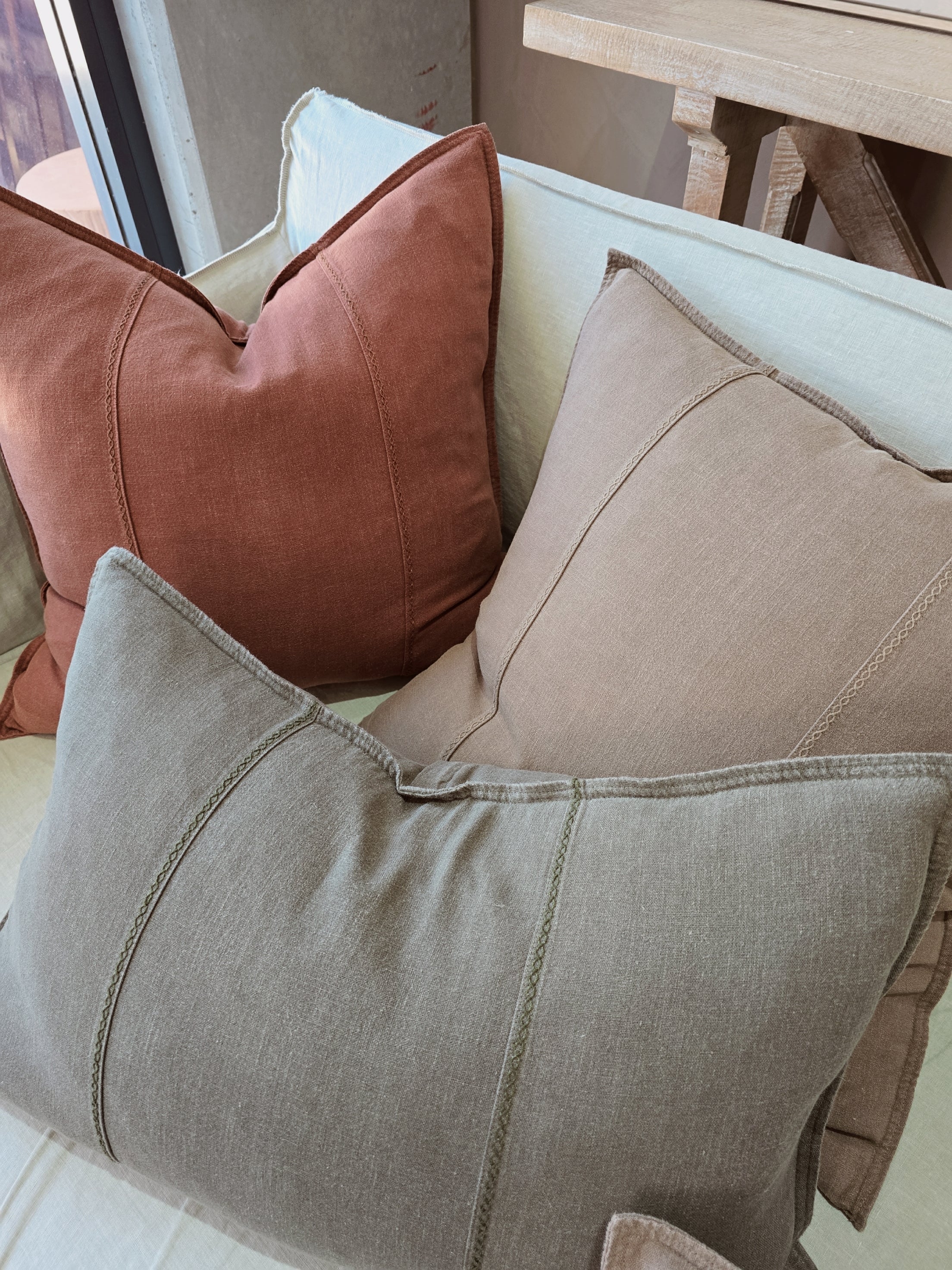 PREORDER JANUARY 2026 DROP | Eveleigh Stonewashed Linen Cotton Cushion 55cm Square - Cinnamon | Embroidery Double Striped