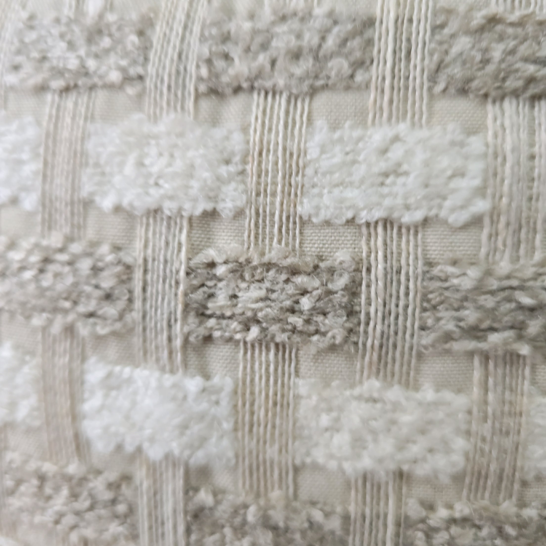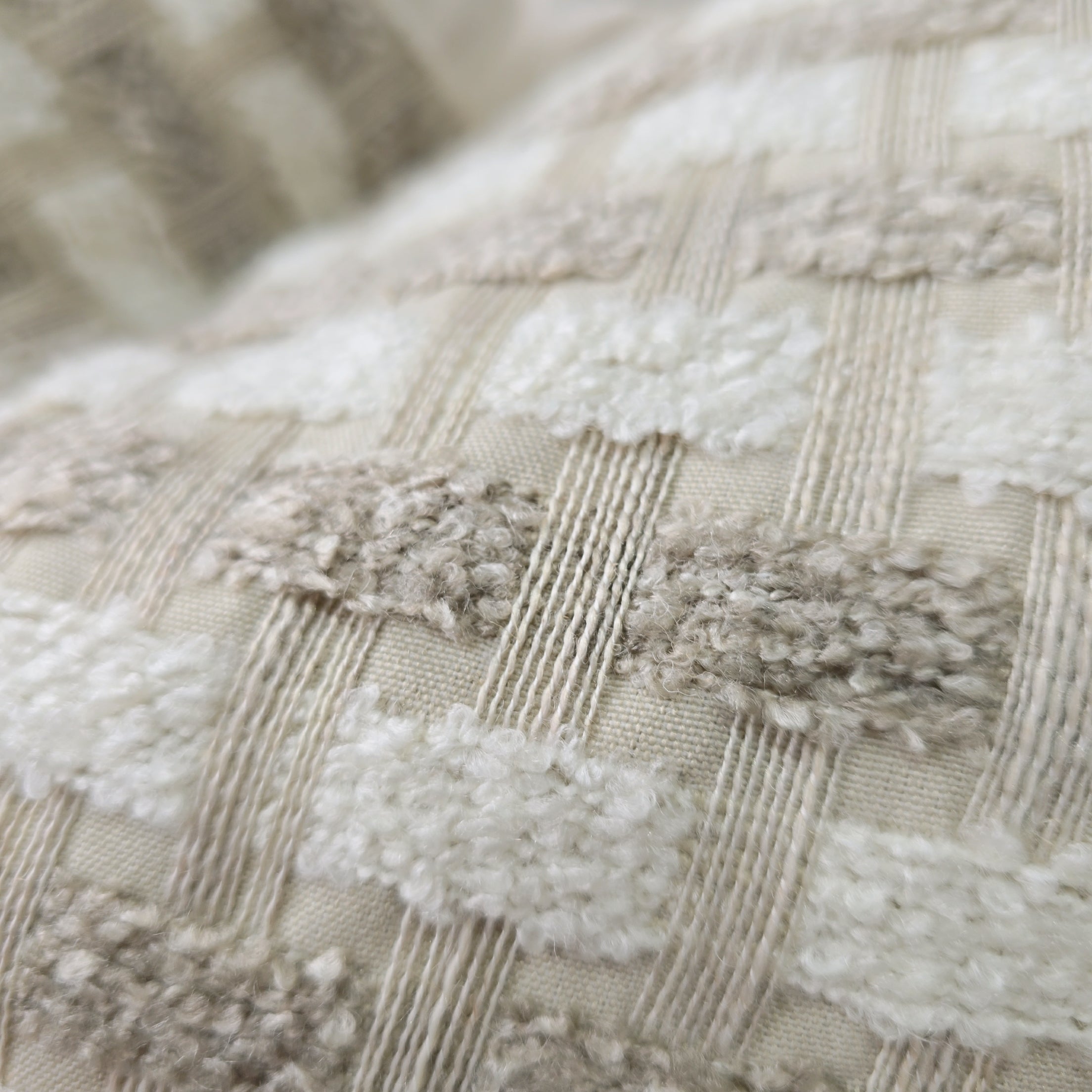The Lattice Collection features a sophisticated raised tufted weave that creates a striking three-dimensional grid pattern. Unlike flat prints, the design showcases plush, dimensional rectangles in a bouclé-inspired texture that contrasts beautifully against the smooth background fabric. This textural interplay delivers exceptional tactile appeal, adding depth and visual interest to any seating arrangement.