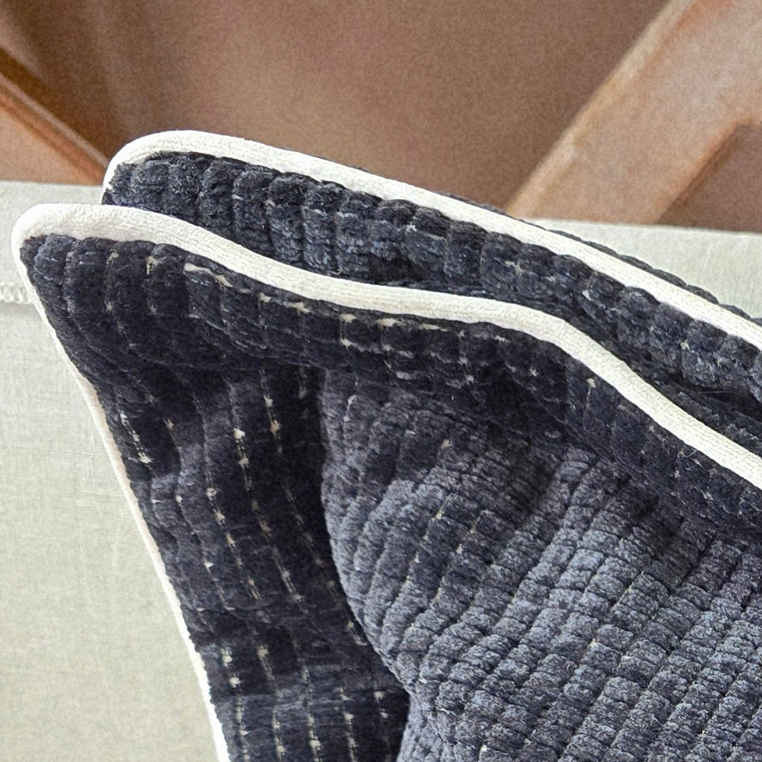 The design is elevated by a contrasting white piping that traces the silhouette. This architectural detail does more than just finish the edge; it frames the soft, organic form of the cushion, giving it a tailored, structural look. It is a perfect balance of 'slouchy comfort' and 'crisp design,' making it a timeless addition to any curated space.